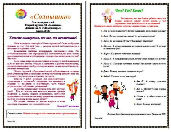 В тираж вышли уже 2 номера, в которых были представлены такие рубрики, как «Ужасно интересно, все то, то неизвестно!»,«Что? Где? Когда?»,«Что делать, если ребенок не задает вопросов?», «Один день из жизни соседней группы». В гостях у воспитателей старшей группы № 11», «Праздники календаря», «Советуют специалисты», «Литературная страничка».