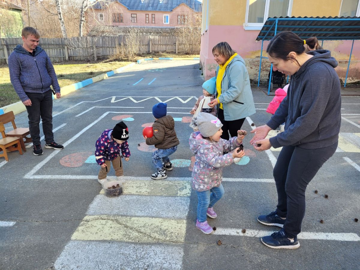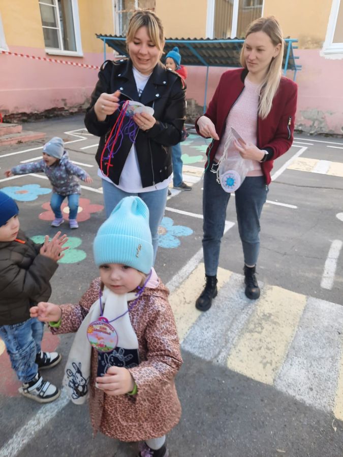 Педагоги групп СП «Малышок» провели спортивное развлечение с родителями на свежем воздухе. Малыши вместе с мамами и папами прошли весёлую эстафету, в которой перешагивали через препятствие, побегали змейкой, попрыгали через обручи и донесли свои мячики в нужную корзинку. Затем под забавное музыкальное сопровождение ребята совместно с родителями и воспитателями поиграли в подвижные игры «Паровозик» и «У медведя во бору». В конце все участники получили свои заслуженные медальки.