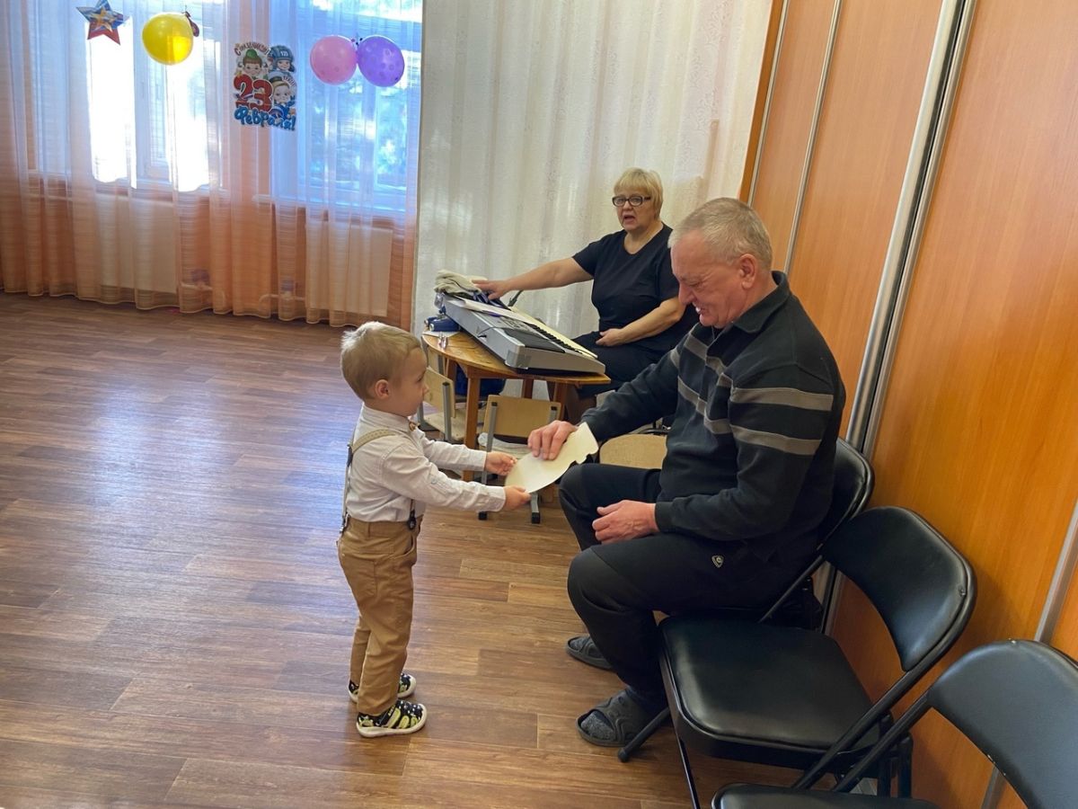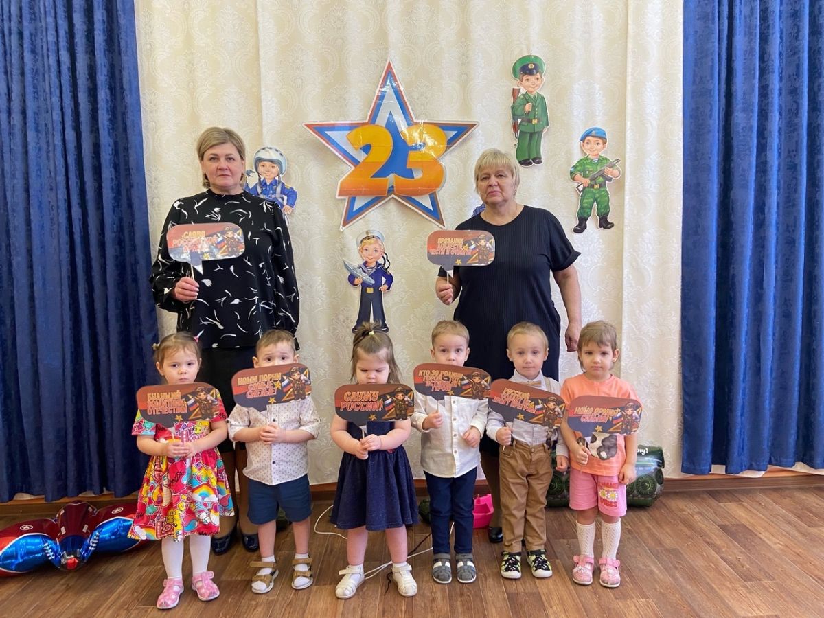 В преддверии праздника в группе "Светлячки"(с 2-3 лет) прошло тематическое развлечение "Мы- солдаты".Малыши познакомились с праздником, с воинами- защитниками Отечества, с военной техникой, атрибутами, формой одежды солдат. Дети исполняли песенки, читали стихи, играли в подвижную игру"Самолёты", выполняли игровые упражнения"Попади в цель", "Танкисты". К празднику дети подготовили подарки- открытки для пап. Все получили большое удовольствие и отличное настроение на весь день.